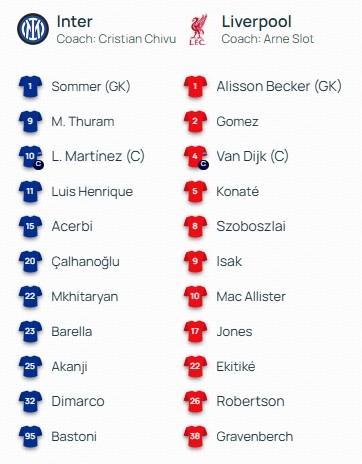 国米首发:1-索默、9-马库斯-图拉姆、10-劳塔罗-马丁内斯、11-路易斯-恩里克、15-阿切尔比、20-恰尔汗奥卢、22-姆希塔良、23-巴雷拉、25-阿坎吉、32-迪马尔科、95-巴斯托尼